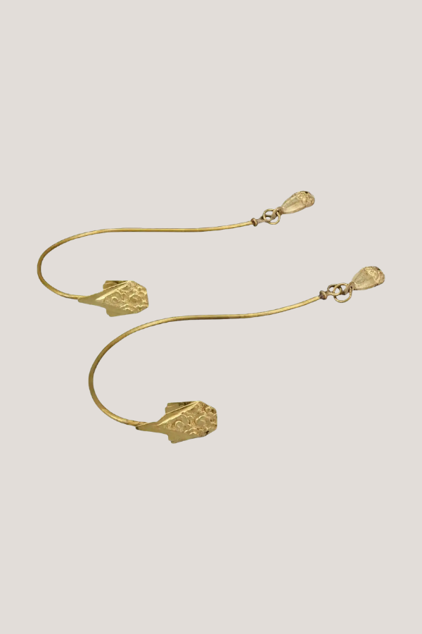 These brass tiebacks are shaped like two stylized hands reaching toward each other around the curtain. The fingers are long and simplified, and the whole piece is made from one continuous curved line. In use, the curtain sits right in the middle, so the holdback looks almost like a bracelet or cuff around the fabric.