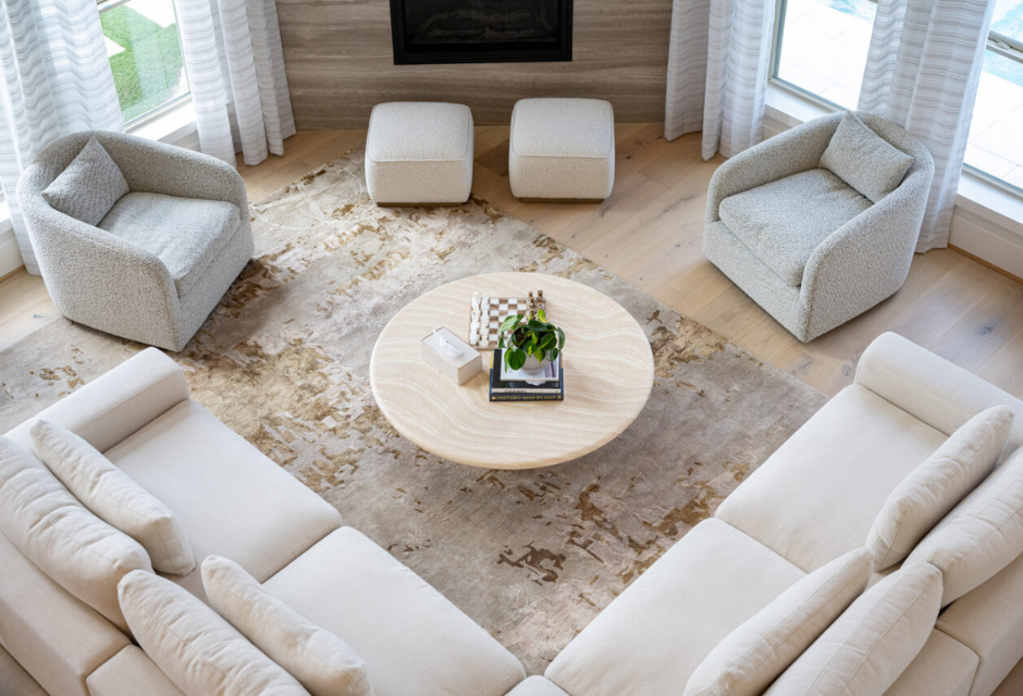 The chair next to it has a cocoon-like shape that supports the body, proving how often comfort and silhouette work together in this style. Designers use these compact, rounded pieces because they provide sculptural presence and weight without adding a lot of visual bulk. The palette is whisper-light (pale upholstery, blonde floors, a low-contrast rug), which allows textures and shapes to create the depth color usually would.